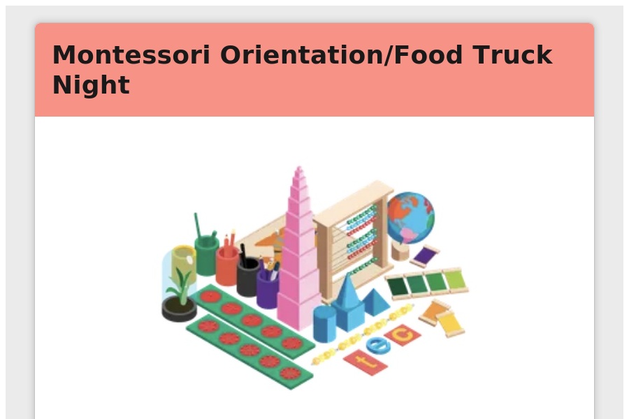 Montessori Orientation/Food Truck Night Montessori Orientation 9/17 Montessori FamilyOrientationNight Cooper Montessori Families, I would like to invite you all. . .