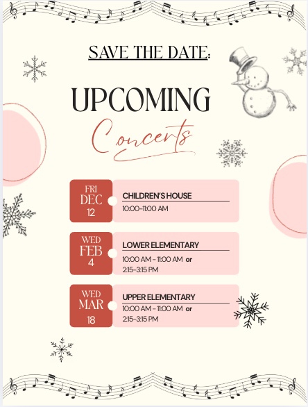 [Tuesday, Feb 3 at 10:10 AM]Don't forget the upcoming concert tomorrow. Feel free to choose the time slot that is most convenient. See you there!